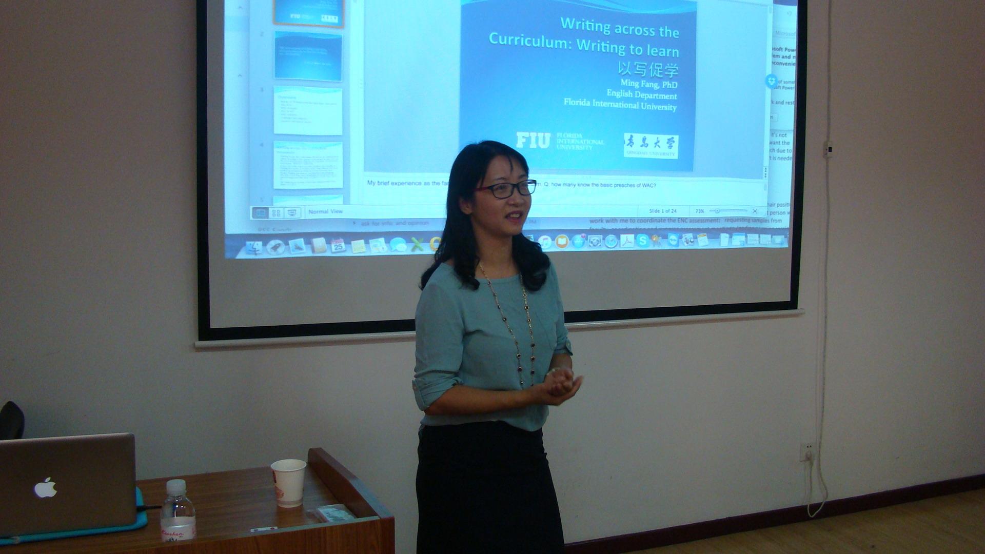 师生做了题为“Writing Across Curriculum : Writing to Learn 以写促学”的专题学术讲座,介绍美国大学课程学习中写作的重要性和教学实践中以写促学的理念,并通过展示各类学科以写促学习的实例,探讨以写促学的意义、具体方法及挑战。