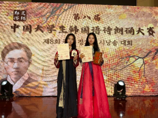 朝鲜语系学生的朗诵作品为《산에서 온 새(山鸟)》,两位同学充分展现了自己在朝鲜语发音、情感表达等方面的语言基本功,将声音、情感与富有意境的场景融合在了一起,予观众一场视听盛宴。经过评委们的评选,最终获得二等奖的佳绩。