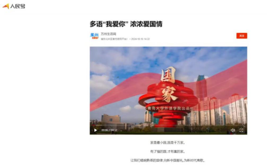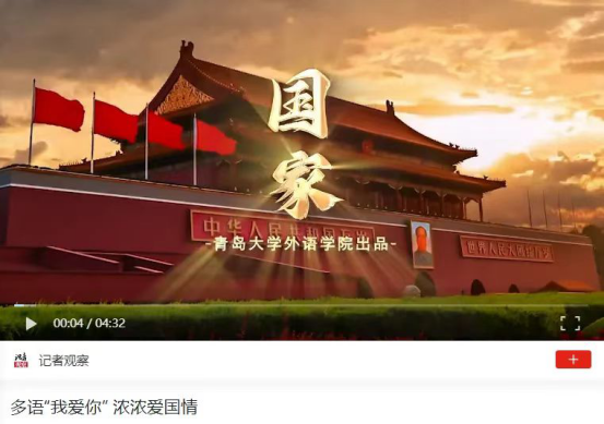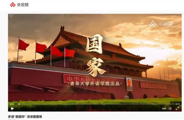 策划了红色歌曲MV《国家》的拍摄。学院师生齐唱《国家》为新中国献礼。在视频中,师生发挥专业优势,用多国语言“我爱你”为祖国母亲送上深情告白,用嘹亮的歌声和饱满的热情诠释着对祖国的爱与祝福。视频一经发出,吸引了校内外众多媒体的关注,学习强国、人民日报、人民视频、央视频等多家媒体进行了转发推广,获得了一致好评。