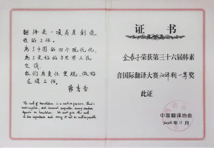 朝鲜语系金春子副教授获“韩素音国际翻译大赛”一等奖、德语系学生任满意获二等奖