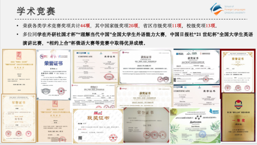班级学生在各类学术竞赛中屡获佳绩,共斩获44项奖项,其中国家级20项、省市级11项、校级13项。学生在外研社“国才杯”、“理解当代中国”全国大学生外语能力大赛、“相约上合”杯俄语大赛等赛事中表现优异,多次获得国家级和省级奖项,充分展现双语专业素养。