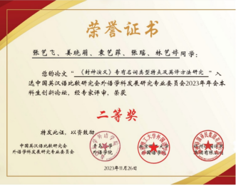优秀毕业论文;2人的毕业论文推荐参评校级优秀毕业论文。学生的大创相关论文《〈封神演义〉专有名词类型特点及英译方法研究 》入选中国英汉语比较研究会外语学科发展研究专业委员会2023年年会本科生创新论坛并获二等奖;也有学生拥有软件著作权。