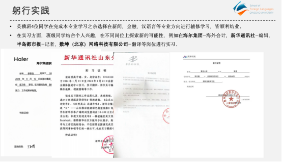 班级多位学生在完成本专业学习之余选择在新闻、金融、汉语言等专业方向进行辅修学习,皆顺利结业。在实习方面,学生结合个人兴趣,在不同岗位上探索新的可能性,例如在海尔集团、新华通讯社、半岛都市报、数坤(北京)网络科技有限公司等岗位进行实习。学生在不同行业、不同类型的岗位上积极探索,既将自身能力转化为实际工作效能,也在实践中明晰了职业方向,为未来发展积累了宝贵的实战经验。
