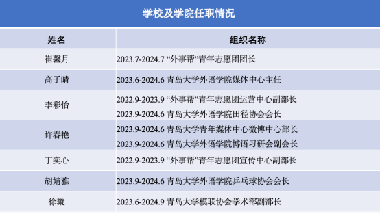 在志愿服务领域,他们活跃于中欧企业家峰会,上合组织民间友好论坛暨城市友好论坛,第三届中国—拉美和加勒比农业部长论坛,中国—俄罗斯教育文化交流会暨教育展等多个大型会议的志愿服务活动。在乌兹别克斯坦文旅代表团访问,2023-2024克利伯环球帆船赛青岛站,青岛马拉松等多项活动中担任志愿者。