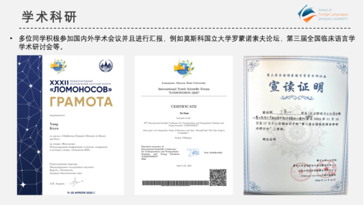 学术科研方面,多位学生积极参加国内外学术会议并且进行汇报,例如莫斯科国立大学罗蒙诺索夫论坛,第三届全国临床语言学学术研讨会等。在优秀毕业论文评选中,1人获得英语系优秀毕业论文;4人获得 A片无码
