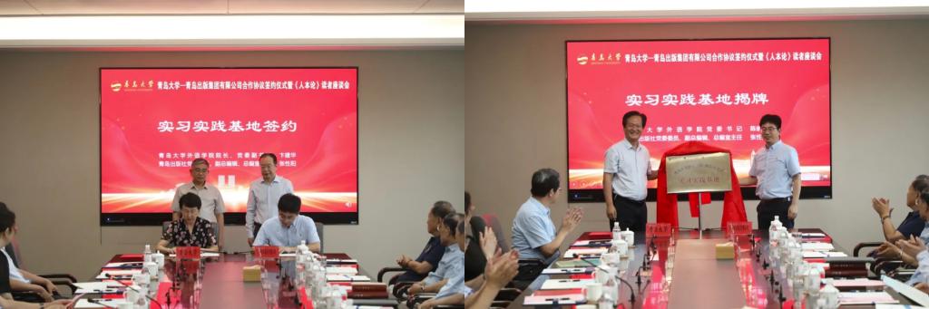 ——青岛出版社实习实践基地”,实现资源共享、互惠共赢。院长卞建华和青岛出版社副总编辑、总编室主任张性阳作为双方代表签署协议,院党委书记陈崇研和张性阳为实习实践基地揭牌。