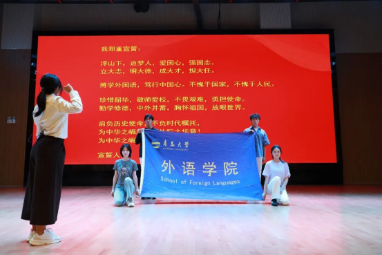 在蓝倩雯同学的带领下,全体新生肃立宣誓。誓言铿锵,信念如磐,展现了2025级外院学子昂扬的精神风貌和矢志奋斗的坚定决心。