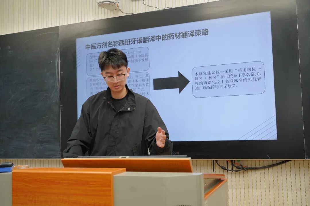 张赟睿以《生态翻译学视域下〈金匮要略〉方剂名西班牙语翻译研究》为题在翻译传播分论坛进行汇报。该研究以生态翻译学理论为基础,构建《金匮要略》汉西双语平行语料库,运用语料统计与翻译实证分析方法,系统探讨《金匮要略》方剂名称在西班牙语译本中的逻辑连接词显化策略及药材术语翻译。