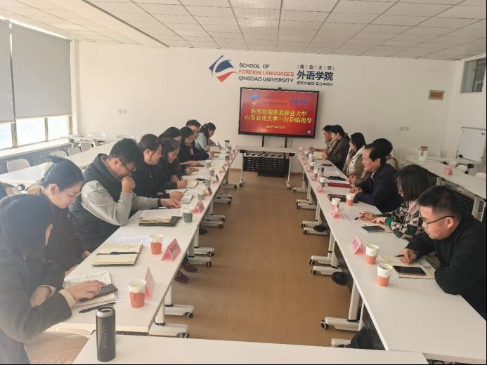 12月11日下午,东北林业大学外国语学院院长董辉、副院长王佳音、英语系主任孙立轩,山东农业大学外国语学院院长李伟、党委副书记费美娟、副院长李桂东、团委书记李娜,以及大学英语系主任尹卓琳、英语专业主任高迎、日语专业主任杨阳、俄语专业主任张帅臣、商务英语专业主任李棠一行到A片无码