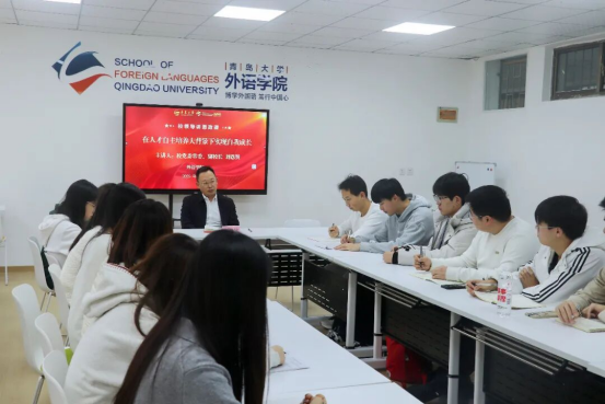 在交流环节,刘恩贤与学生就“新经济发展形势下人工智能等前沿科技如何重塑外语学生职业发展能力”、“新文科背景下外语专业学生的成长路径选择”、“如何将个人价值的实现与宏大的国家需要紧密结合”等问题展开深入交流。