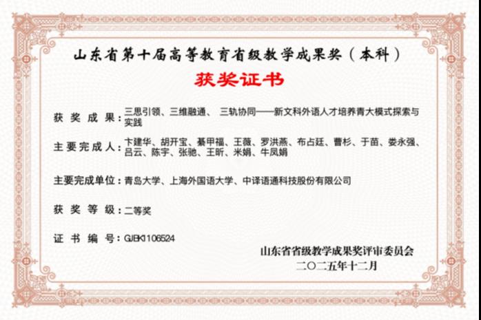 院长卞建华教授领衔,联合上海外国语大学、中译语通科技股份有限公司共同完成的教学成果《三思引领、三维融通、 三轨协同——新文科外语人才培养青大模式探索与实践》荣获二等奖。A片无码