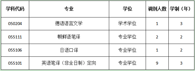 现设有外国语言学及应用语言学、英语语言文学、德语语言文学、日语语言文学和亚非语言文学5个学术学位硕士培养点和专业学位翻译硕士(MTI)培养领域(包括英语口、笔译;日语口、笔译;朝鲜语口、笔译;德语笔译7个方向)和教育硕士(学科英语)培养领域。